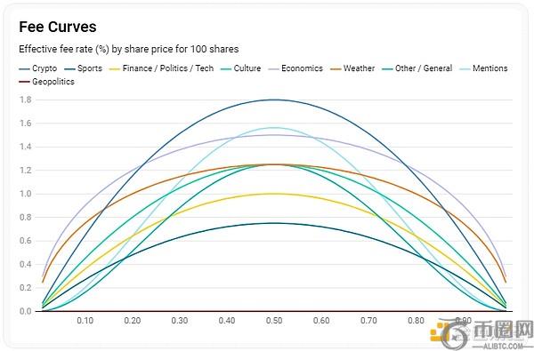自2026年3月30日起,包括加密货币、经济、文化、天气及政治等在内的所有主要市场类别均将启用吃单手续费。费用计算基于交易价格与合约概率,采用非线性模型,确保在结果不确定性**时(即50%概率附近)达到峰值。