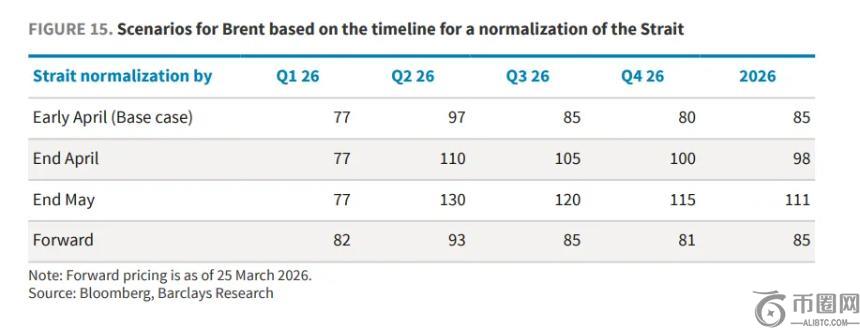 巴克莱认为,油价走势将在三个关键时间节点上出现分叉:若霍尔木兹海峡在4月初恢复正常通行,布伦特原油2026年均价维持在85美元/桶;若推迟至4月底,均价或重定为约98美元/桶;若拖延至5月底,可能触及111美元/桶。每延误一天,库存缺口以雪球效应传导,持续推高价格**。