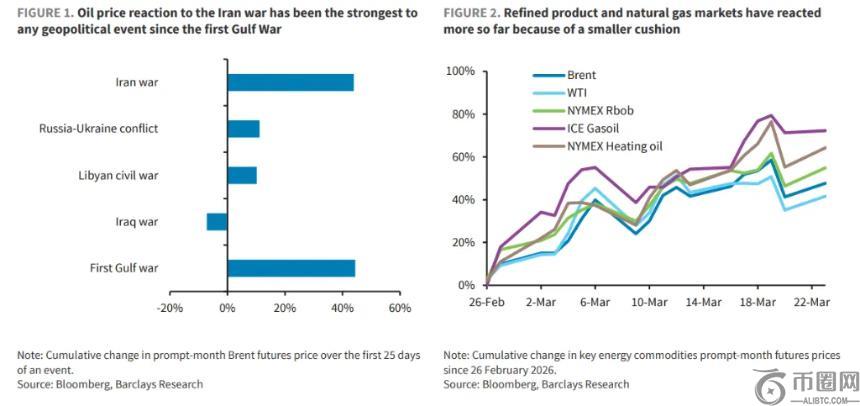 自2026年2月26日伊朗战争爆发以来,全球能源市场遭遇了自1990年海湾战争以来最剧烈的地缘政治冲击。布伦特原油在短短25天内**44%,美国汽油批发价(Rbob)上涨48%,柴油价格分别攀升51%与58%,欧洲市场亦面临严峻压力。