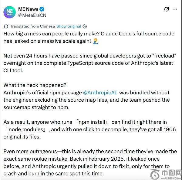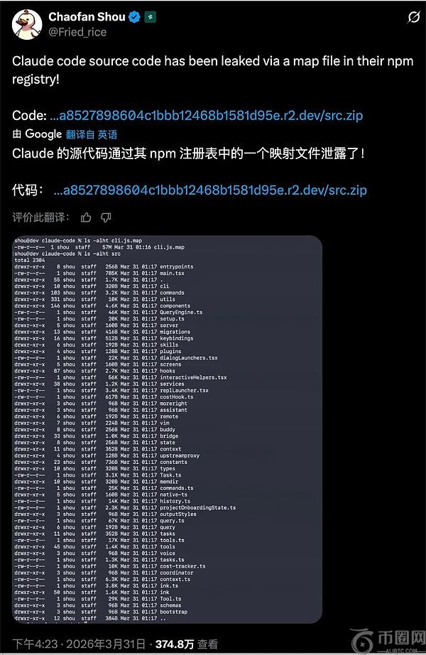 AI 社区掀起轩然**!近日,一名名为 Chaofan Shou 的 X 账号发布消息指出,Anthropic 的 Claude Code 工具在 npm 包中意外上传了源码映射文件(source map),导致其完整源代码被公开。