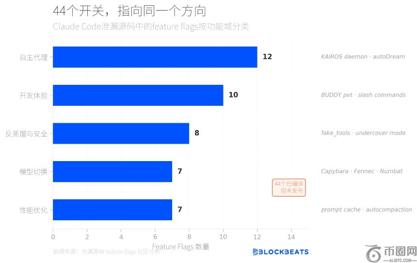 泄漏代码中隐藏着44个已编译的功能开关(feature flags),按功能域分为五类。其中最密集的是“自主代理”类(12个),指向名为KAIROS的系统。
