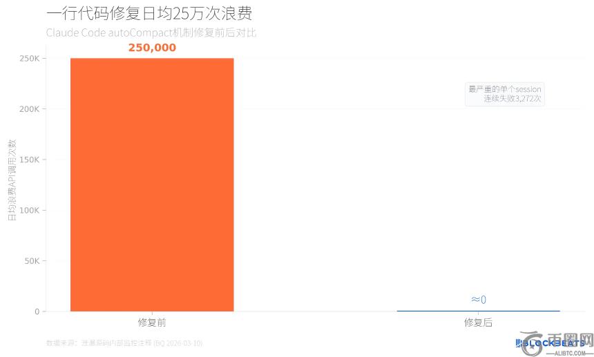 据autoCompact.ts文件注释(标注日期2026年3月10日)显示,在引入自动压缩失败上限前,每天约浪费25万次API调用。有1279个用户会话出现50次以上连续压缩失败,**重者达3272次。修**式仅为添加一行限制:MAX_CONSECUTIVE_AUTOCOMPACT_FAILURES = 3。