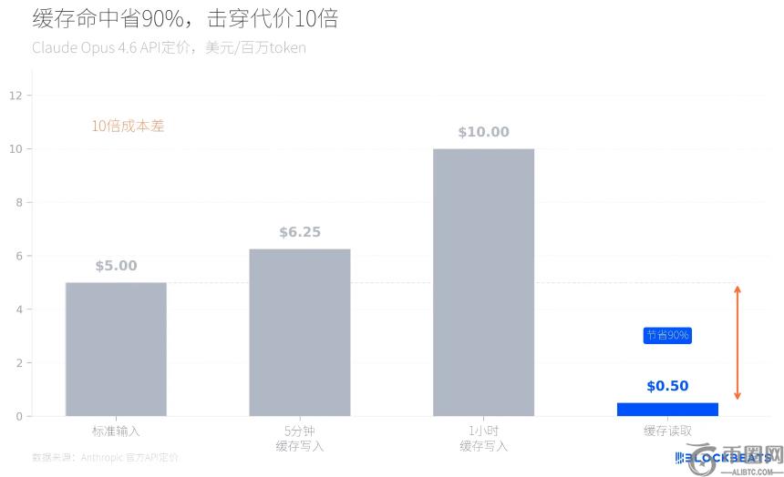 以Claude Opus 4.6为例,标准输入价格为每百万token 5美元,若命中缓存,读取价格仅需0.5美元,便宜90%。反过来说,每一次缓存击穿,推理成本便翻10倍。