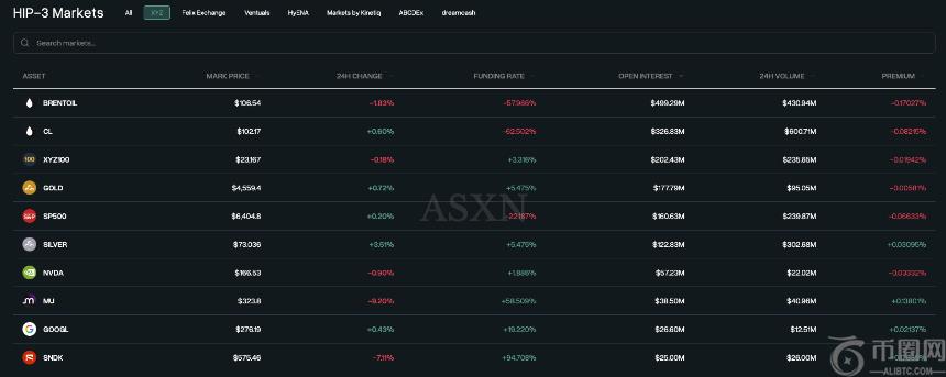 从数据来看,HIP-3已形成以真实世界资产(RWA)为核心的交易生态。其中,trade.xyz主导的前十大市场中,原油合约占据**,其次是纳指100指数合约,标志着其正式迈入大宗商品与宏观资产交易领域。