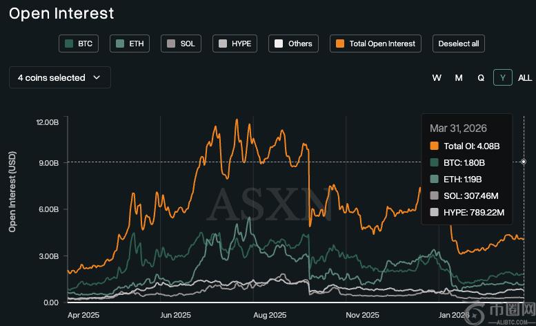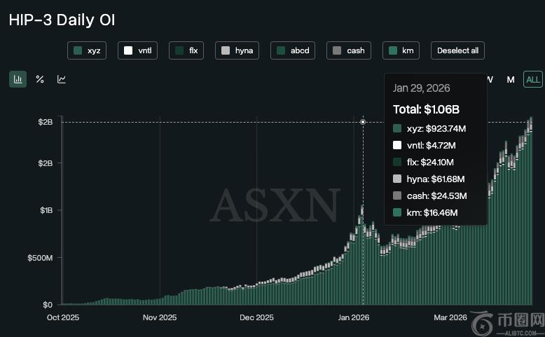 受此影响,HIP-3的OI持续攀升,3月1日再度突破10亿美元,并于3月31日达到20亿美元,月内增长超100%。此时,其占平台总OI比例已超过50%,超越BTC合约(18亿美元)与ETH合约(11.9亿美元),成为核心驱动力。