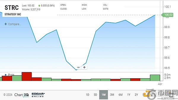 3月13日,Strategy推出的永续优先股Stretch($STRC)通过即时发行(ATM)方式实现募资新高,当日成交量达730万股,是日均水平的471%。该次交易使连续九天增长,几乎为前一日两倍,所获资金足以购入约4,038枚比特币。当时,STRC股价稳定在100美元,展现出对固定收益投资者的强大吸引力。