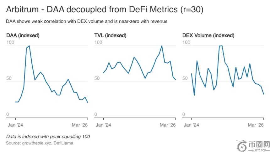 Base的用户上线是为了交易,交易量下降时他们就会离开。而Arbitrum的用户则不受手续费水平的影响,用户数量和手续费收入之间的相关性几乎为零。Base吸引的是游客,而Arbitrum却不知何故留住了用户。