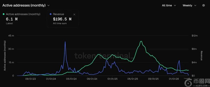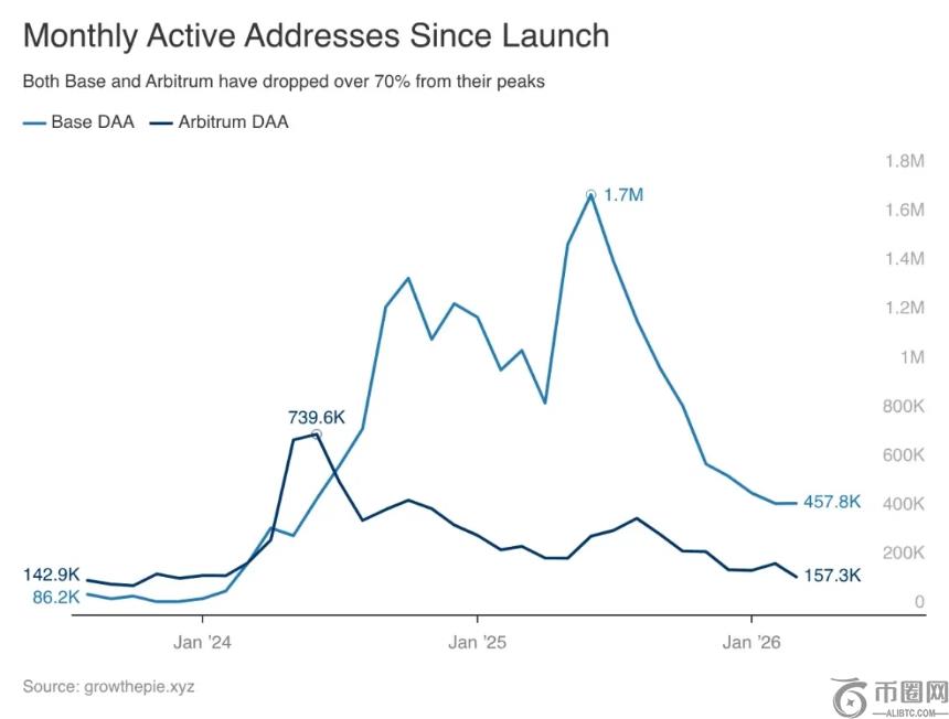 Base日活地址在2025年6月达到峰值172万。到2026年3月,仅剩45.8万,较高点暴跌73%。在Armstrong2025年9月宣布Base考虑发币后,短短六个月内活跃地址减少54%,这意味着投机资金**离场。
