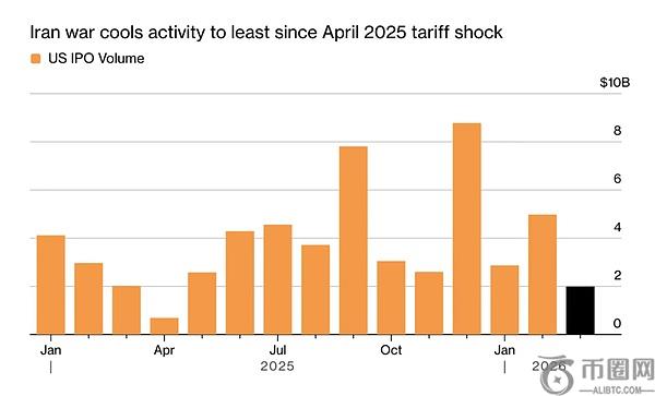 彭博社数据显示,2026年**季度前十大IPO中,七家目前股价已跌破发行价,中位跌幅达28%。与此同时,伊朗局势紧张导致三月成为近一年来最冷清的IPO月份之一。