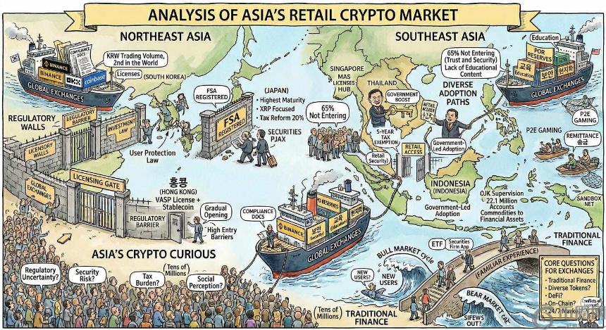 本报告由 Tiger Research 撰写,尽管加密货币市场增长迅速,但散户投资者数量却呈现下降趋势。我们深入分析了亚洲九个潜在用户群体**的市场的准入门槛,以及交易所的应对措施。