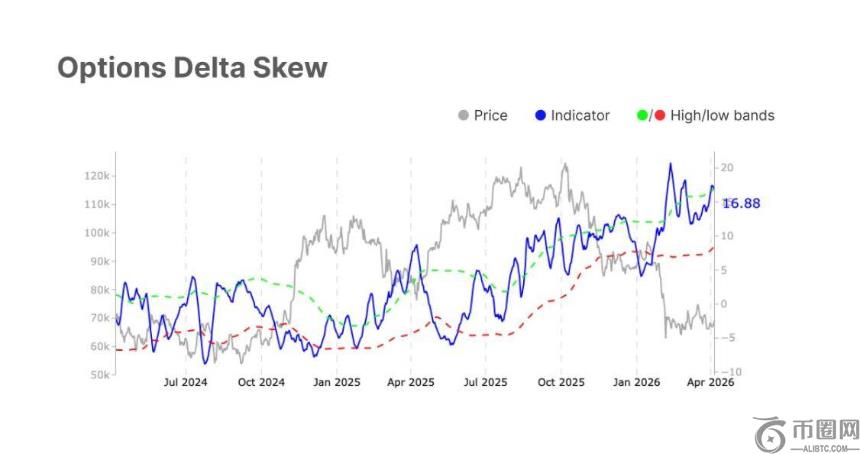 然而,链上基本面恢复仍滞后:已实现市值变化从-0.6%进一步降至-0.7%,意味着新资金尚未大规模回流;Hot Capital Share从21.0%降至20.1%,短期投机性资金持续流失;25-Delta偏斜升至16.88%,期权市场对下行风险的定价仍未消退。