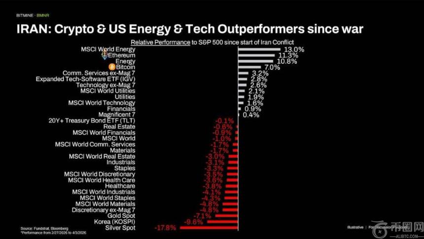 值得注意的是,自2月27日伊朗战事爆发至4月3日,相对标普500的超额收益排名中,前四名分别为MSCI全球能源( 13.0%)、以太坊( 11.3%)、美国能源板块( 10.8%)和比特币( 7.0%),表明地缘紧张下,风险资产表现优于传统避险品。