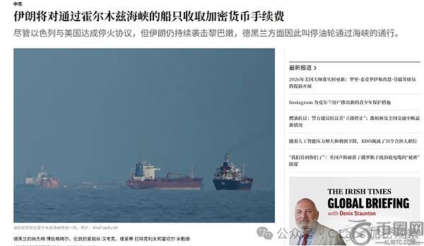 4月8日,伊朗石油、天然气和石化产品出口商联合会发言人侯赛尼(Hamid Hosseini)向英国《金融时报》证实:所有经由霍尔木兹海峡的满载油轮,必须按货物折算缴纳加密货币过路费——标准为每桶原油约1美元,主要支付币种为比特币。