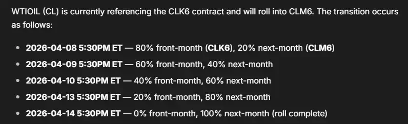 根据 Trade.xyz 官方文档,预言机将在5个交易日内,将价格权重从100%近月合约**过渡到100%远月合约。