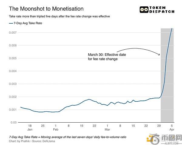 1 月至 3 月下旬,这一比例逐步上升,从约 0.001 翻倍至 0.002;3 月 30 日之后,该费率直接增长两倍,突破 0.007,相当于每 100 美元交易额可带来约 0.7 美元的收益。