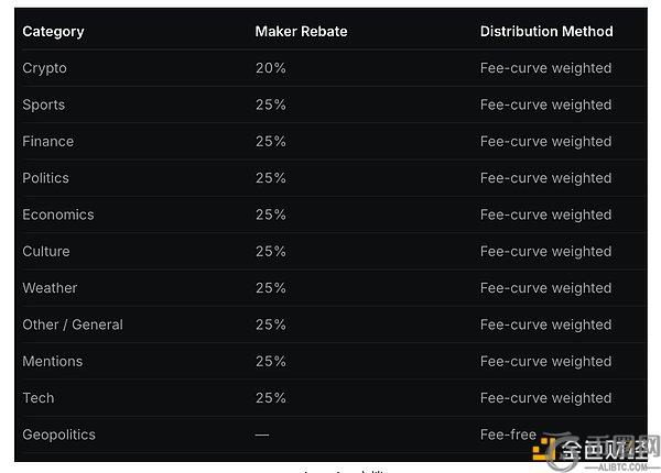 返佣机制吸引了更多做市商入驻,进而优化流动性、吸引更多主动交易者。不同品类的返佣比例各不相同:加密货币品类 20%,政治与体育品类 25%,金融品类 25%;仅地缘政治市场不收取主动交易者手续费,也不向做市商提供返佣。