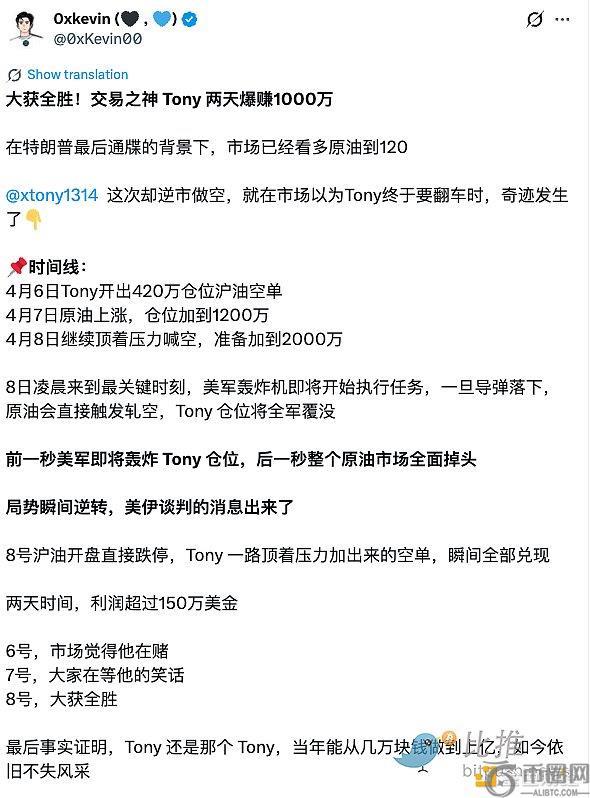 另一方面,交易之神Tony凭借精准操作,在短短两天内爆赚1000万,成为热议话题。其持仓策略引发广泛讨论——尽管在比特币价格剧烈波动中仍保持大仓位做空,与传统原油做空逻辑形成反差,展现出极强的风险控制与趋势判断能力。