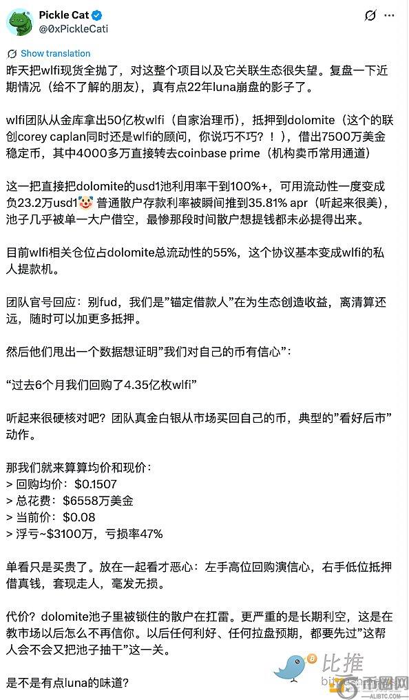近日,与特朗普家族相关的加密项目WLFI因团队操作引发信任危机(FUD)。有质疑指出,“团队Dolomite大额抵押借贷引质疑,左手回购演信心、右手抵押**”,进一步加剧了市场对该项目的担忧。此类行为被广泛认为是典型的“信心表演”模式,严重削弱了投资者对项目的长期信心。