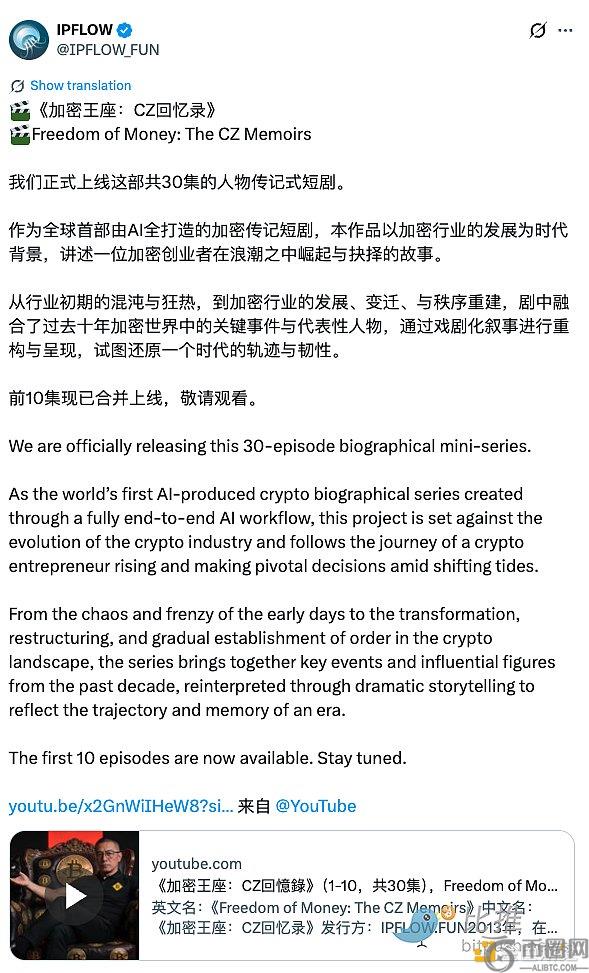 与此同时,全球首部由AI全打造的加密短剧《加密王座:CZ回忆录》正式上线,吸引了众多加密爱好者的关注。这部作品以虚拟叙事方式还原行业关键人物的成长轨迹,成为链上文化输出的新范式。观看链接:点击这里。