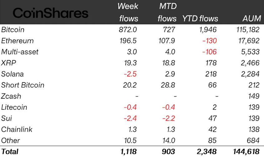 全球加密货币交易所交易产品(ETPs)在上周录得高达11亿美元的资金流入,成为2026年以来表现最为强劲的一周,仅次于一月中旬21.7亿美元的峰值。其中,比特币以8.71亿美元的流入额占据主导地位,展现出机构投资者持续的配置需求。