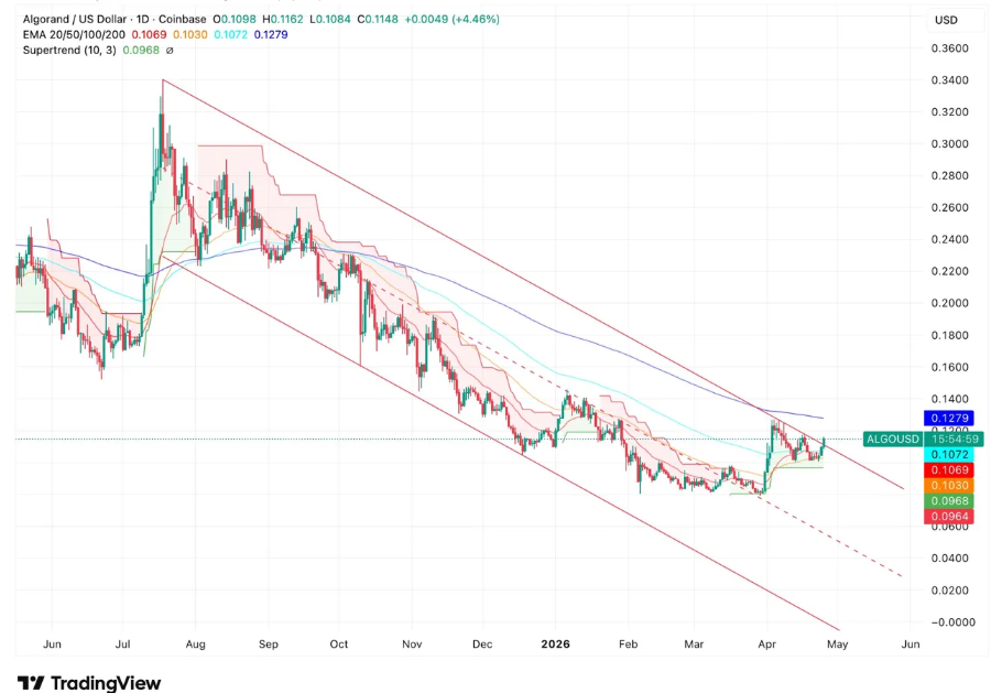 在日线图上,ALGO价格走势显示其在一个交易日内同时突破了20日、50日和100日指数移动平均线,这一结构自去年9月以来一直压制着价格反弹。