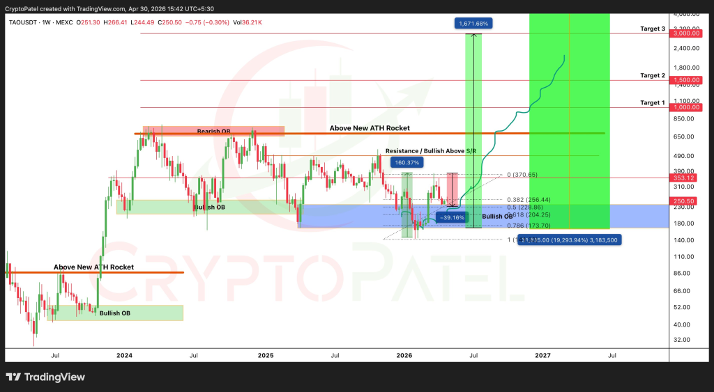 图表同时表明,若TAO价格复苏并突破主要阻力位,将存在更大的上行空间。**关键上行目标位于1000美元附近,其次是1500美元与3000美元。